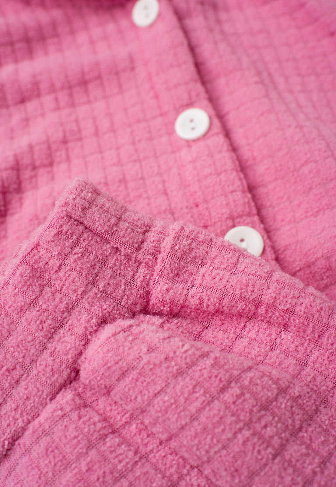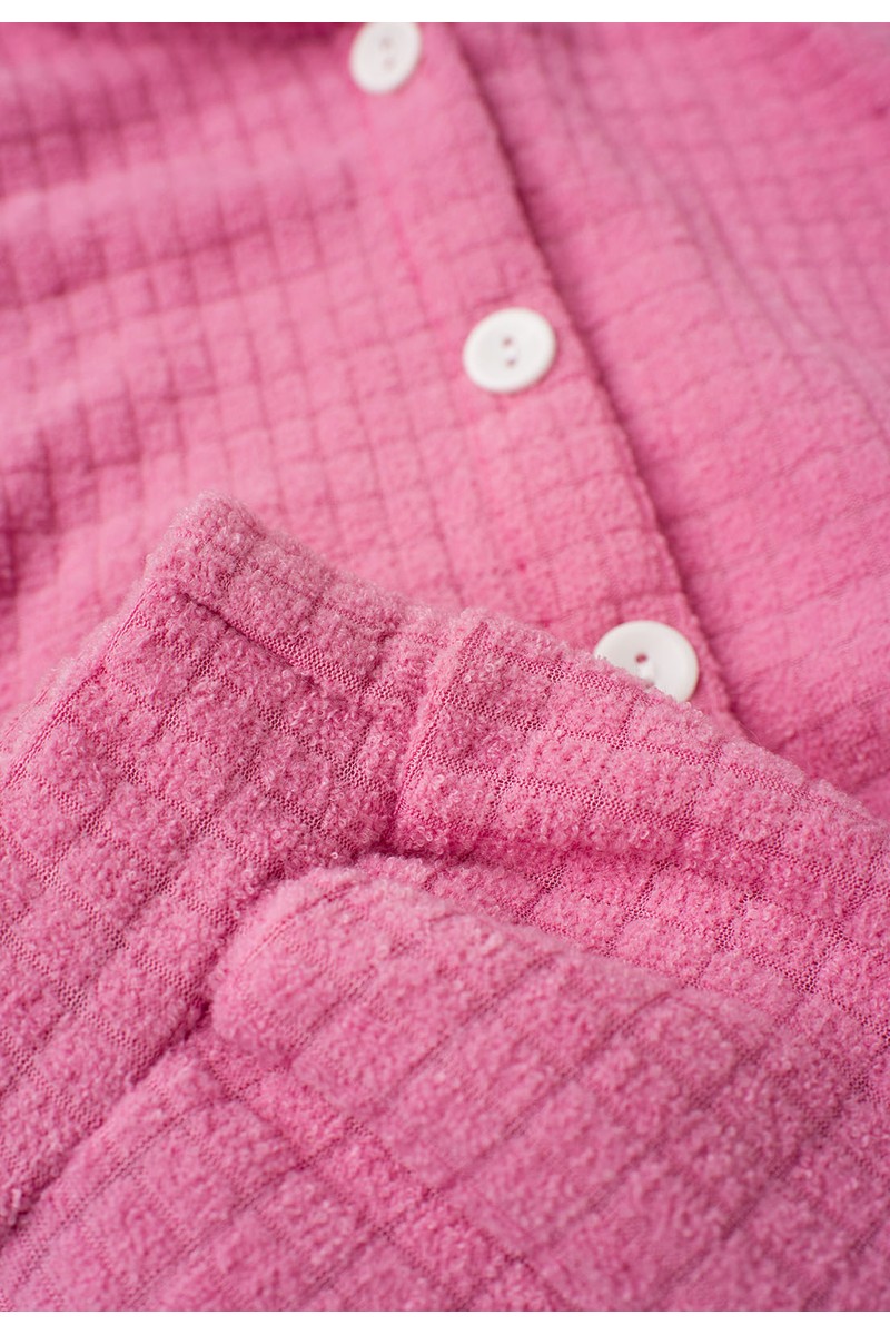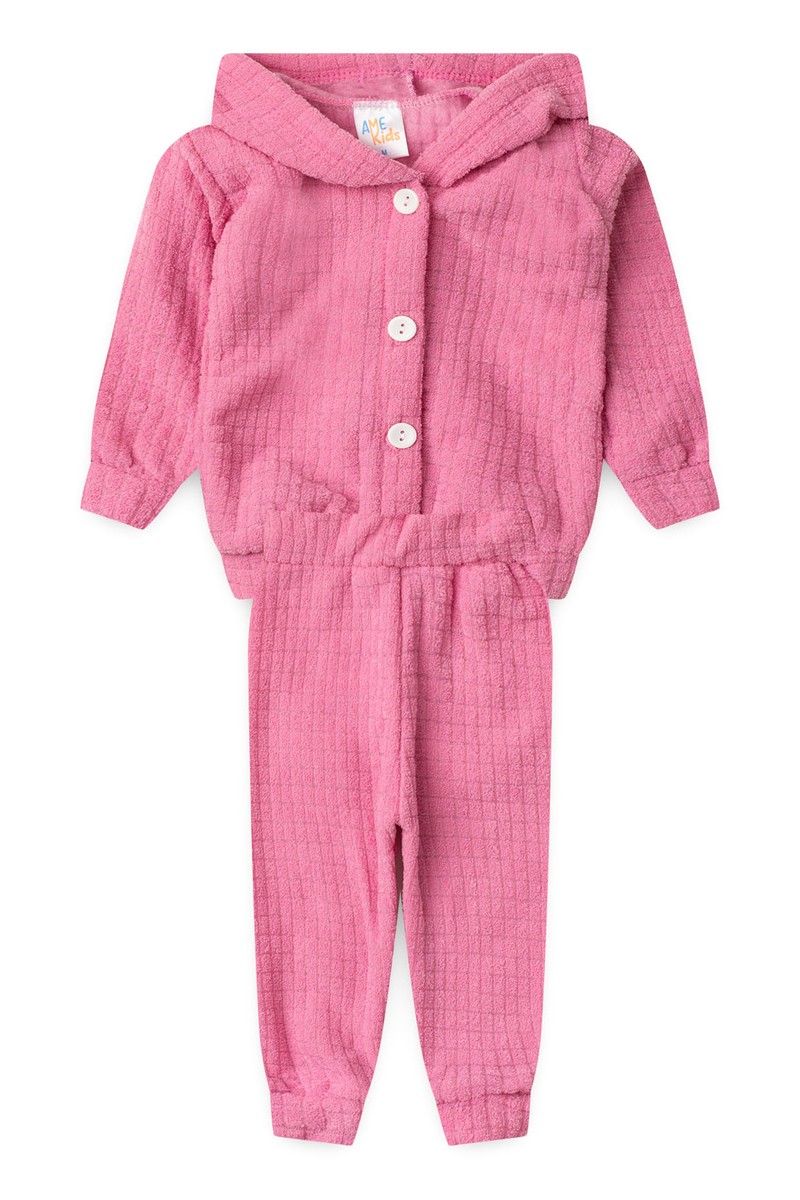 A blusa possui fechamento frontal com botões que facilita na hora de vestiir. A calça com elástico na cintura garante ajuste confortável e liberdade nos movimentos.