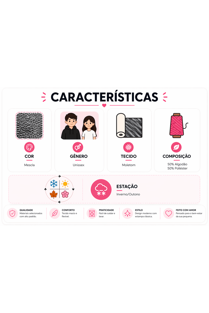O básico que é simplesmente perfeito! Nosso conjunto de moletom une conforto, praticidade e um toque de charme que faz toda a diferença no dia a dia dos pequenos.