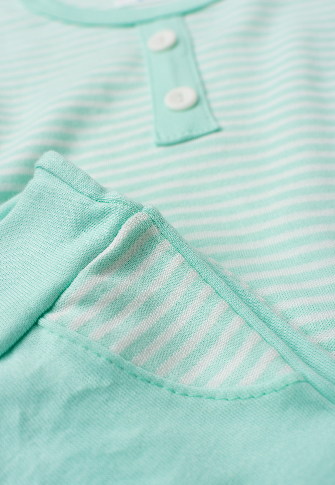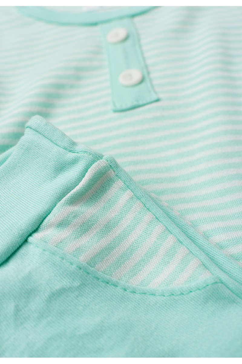 Os botões frontais facilitam ao vestir, enquanto a calça lisa com bolsos frontais decorativos listrdos garante praticidade e conforto.