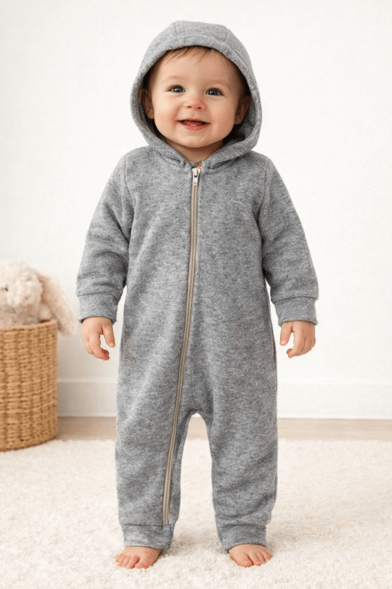 Este macacão em tecido bouclé possui textura macia e quentinha, ideal para manter o bebê protegido com suavidade.