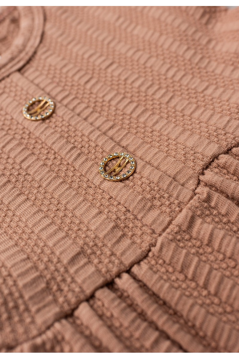 Vestido em malha estruturada, com textura suave e detalhes, trazendo um toque moderno e elegante. Possui dois botõezinhos frontais decorativos que deixam a peça ainda mais charmosa.